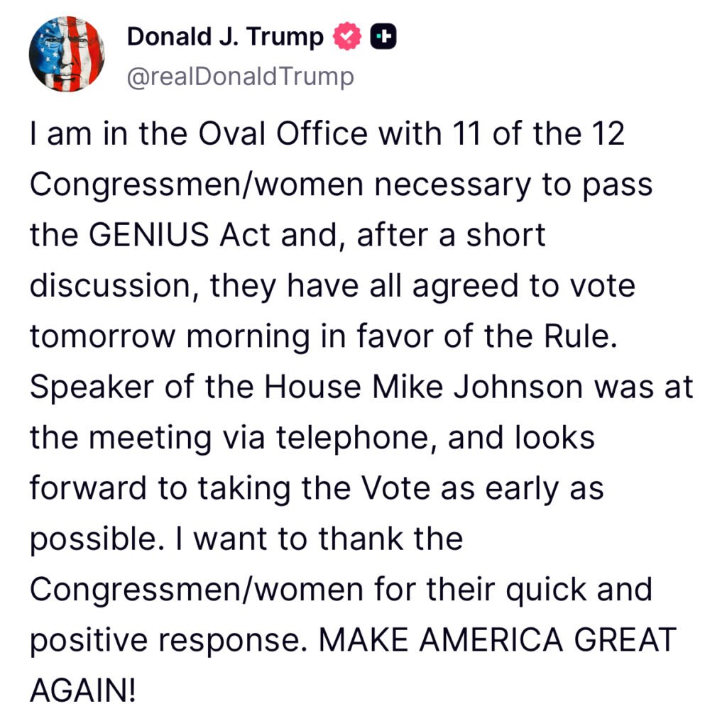 This highlights a sudden shift in U.S. legislative support for the GENIUS Act, a pro-crypto bill, after President Trump convinced 11 out of 12 initially opposing representatives, reflecting his growing influence in the crypto policy arena following a failed vote on July 15, 2025, driven by concerns over Central Bank Digital Currencies (CBDCs).