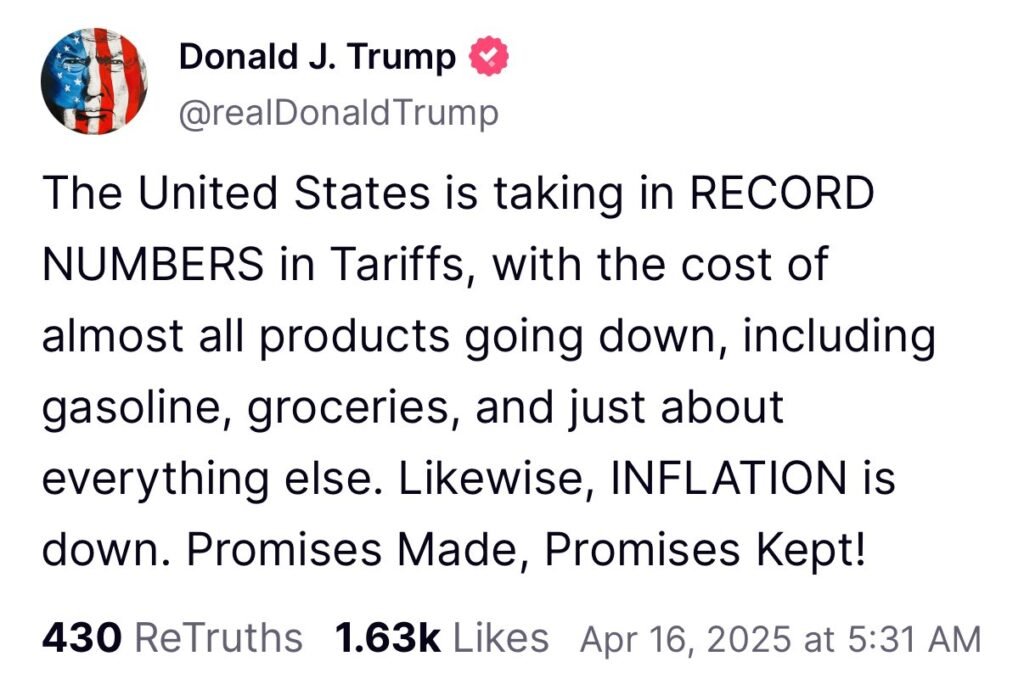Donald J. Trump’s X post claims the U.S. is collecting record tariff revenue while costs of goods like gasoline and groceries are dropping, alongside reduced inflation, aligning with his campaign promises of economic improvement through trade policies.